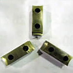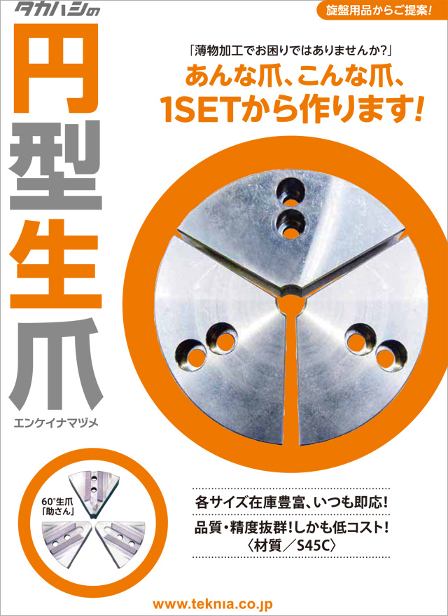 • 角爪が幅3cmの棒状で、3方向(3点)から材料を固定するのに対して円型生爪は120°扇形で包み込む形状。